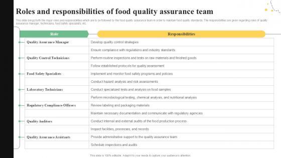 Want to ace your presentation in front of a live audience Our Roles And Responsibilities Of Quality Control Guide For Food PPT Slide can help you do that by engaging all the users towards you. Slidegeeks experts have put their efforts and expertise into creating these impeccable powerpoint presentations so that you can communicate your ideas clearly. Moreover, all the templates are customizable, and easy-to-edit and downloadable. Use these for both personal and commercial use. This slide brings forth the major roles and responsibilities which are to be followed by the food quality assurance team in order to maintain food quality standards. The responsibilities are given regarding roles of quality assurance manager, technicians, food safety specialists, etc.