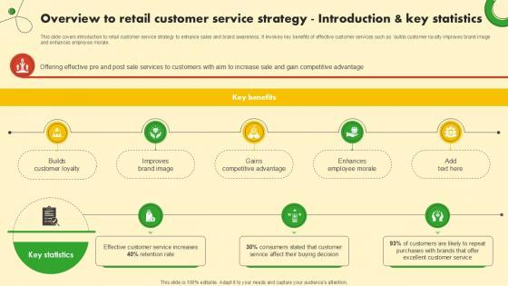 This slide covers introduction to retail customer service strategy to enhance sales and brand awareness. It involves key benefits of effective customer services such as builds customer loyalty improves brand image and enhances employee morale. Crafting an eye-catching presentation has never been more straightforward. Let your presentation shine with this tasteful yet straightforward Overview To Retail Customer Service Food And Grocery Retail Ppt Template template. It offers a minimalistic and classy look that is great for making a statement. The colors have been employed intelligently to add a bit of playfulness while still remaining professional. Construct the ideal Overview To Retail Customer Service Food And Grocery Retail Ppt Template that effortlessly grabs the attention of your audience Begin now and be certain to wow your customers This slide covers introduction to retail customer service strategy to enhance sales and brand awareness. It involves key benefits of effective customer services such as builds customer loyalty improves brand image and enhances employee morale.