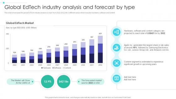 This slide showcases the global EdTech industry analysis by type from 2022-2032 into 3 different areas which includes hardware, software and content. Find highly impressive Global Digital Education Global Edtech Industry Analysis And Forecast By Type IR SS V on Slidegeeks to deliver a meaningful presentation. You can save an ample amount of time using these presentation templates. No need to worry to prepare everything from scratch because Slidegeeks experts have already done a huge research and work for you. You need to download Global Digital Education Global Edtech Industry Analysis And Forecast By Type IR SS V for your upcoming presentation. All the presentation templates are 100 percent editable and you can change the color and personalize the content accordingly. Download now This slide showcases the global EdTech industry analysis by type from 2022-2032 into 3 different areas which includes hardware, software and content.
