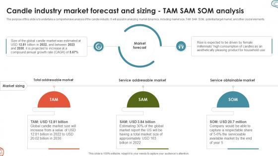 The purpose of this slide is to undertake a comprehensive analysis of the candle industry. It will assist in analyzing market dynamics, including market size, TAM SAM SOM, potential target market, and other crucial elements. Do you have to make sure that everyone on your team knows about any specific topic I yes, then you should give Candle Business Venture Candle Industry Market Forecast And Sizing TAM SAM BP SS V a try. Our experts have put a lot of knowledge and effort into creating this impeccable Candle Business Venture Candle Industry Market Forecast And Sizing TAM SAM BP SS V. You can use this template for your upcoming presentations, as the slides are perfect to represent even the tiniest detail. You can download these templates from the Slidegeeks website and these are easy to edit. So grab these today The purpose of this slide is to undertake a comprehensive analysis of the candle industry. It will assist in analyzing market dynamics, including market size, TAM SAM SOM, potential target market, and other crucial elements.