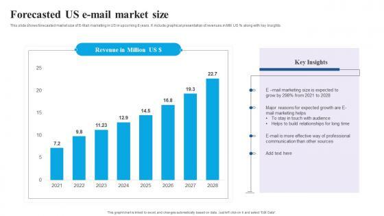 This slide shows forecasted market size of E-Mail marketing in US in upcoming 8 years. It include graphical presentation of revenues in MM US percentage along with key insights. Pitch your topic with ease and precision using this Forecasted Us E Mail Market Size Ideas PDF. This layout presents information on E Mail Marketing, Sources, Communication. It is also available for immediate download and adjustment. So, changes can be made in the color, design, graphics or any other component to create a unique layout.