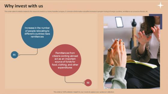 This slide caters to details related to the reason to invest in a money transfer company. It consists of information about the increase in people moving to foreign countries, remittance as a source of funds, etc. The best PPT templates are a great way to save time, energy, and resources. Slidegeeks have 100 percent editable powerpoint slides making them incredibly versatile. With these quality presentation templates, you can create a captivating and memorable presentation by combining visually appealing slides and effectively communicating your message. Download Why Invest With Us Foreign Exchange Company Investor Funding Elevator Pitch Deck from Slidegeeks and deliver a wonderful presentation. This slide caters to details related to the reason to invest in a money transfer company. It consists of information about the increase in people moving to foreign countries, remittance as a source of funds, etc.