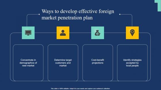 This Ways To Develop Effective Foreign Market Penetration Market Expansion Tactic Elements Pdf from Slidegeeks makes it easy to present information on your topic with precision. It provides customization options, so you can make changes to the colors, design, graphics, or any other component to create a unique layout. It is also available for immediate download, so you can begin using it right away. Slidegeeks has done good research to ensure that you have everything you need to make your presentation stand out. Make a name out there for a brilliant performance. Our Ways To Develop Effective Foreign Market Penetration Market Expansion Tactic Elements Pdf are topically designed to provide an attractive backdrop to any subject. Use them to look like a presentation pro.