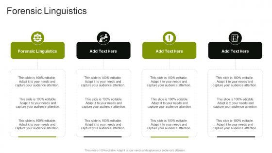 Introducing our well designed Forensic Linguistics In Powerpoint And Google Slides Cpb. This PowerPoint design presents information on topics like Forensic Linguistics. As it is predesigned it helps boost your confidence level. It also makes you a better presenter because of its high quality content and graphics. This PPT layout can be downloaded and used in different formats like PDF, PNG, and JPG. Not only this, it is available in both Standard Screen and Widescreen aspect ratios for your convenience. Therefore, click on the download button now to persuade and impress your audience. Our Forensic Linguistics In Powerpoint And Google Slides Cpb are topically designed to provide an attractive backdrop to any subject. Use them to look like a presentation pro.
