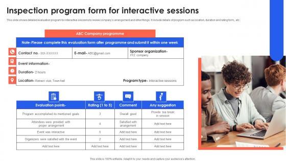 This slide shows detailed evaluation program for interactive sessions to review companys arrangement and other things. It include details of program such as location, duration and rating form,, etc.. Showcasing this set of slides titled Inspection Program Form For Interactive Sessions Download Pdf The topics addressed in these templates are Proper Arrangement, Event Interactive, Program Accomplished All the content presented in this PPT design is completely editable. Download it and make adjustments in color, background, font etc. as per your unique business setting. This slide shows detailed evaluation program for interactive sessions to review companys arrangement and other things. It include details of program such as location, duration and rating form,, etc..