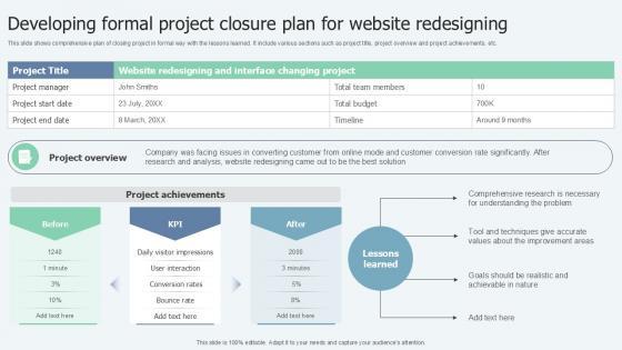 This slide shows comprehensive plan of closing project in formal way with the lessons learned. It include various sections such as project title, project overview and project achievements, etc. Whether you have daily or monthly meetings, a brilliant presentation is necessary. Developing Formal Project Closure DMAIC Methodology To Maintain PPT Slide can be your best option for delivering a presentation. Represent everything in detail using Developing Formal Project Closure DMAIC Methodology To Maintain PPT Slide and make yourself stand out in meetings. The template is versatile and follows a structure that will cater to your requirements. All the templates prepared by Slidegeeks are easy to download and edit. Our research experts have taken care of the corporate themes as well. So, give it a try and see the results. This slide shows comprehensive plan of closing project in formal way with the lessons learned. It include various sections such as project title, project overview and project achievements, etc.