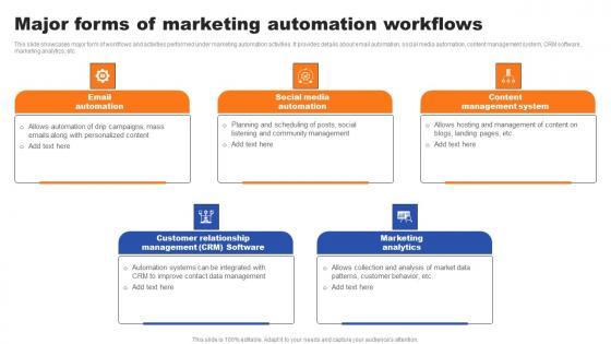 This slide showcases major form of workflows and activities performed under marketing automation activities. It provides details about email automation, social media automation, content management system, CRM software, marketing analytics, etc. Crafting an eye-catching presentation has never been more straightforward. Let your presentation shine with this tasteful yet straightforward Major Forms Of Marketing Automation Workflows Ppt Outline File Formats template. It offers a minimalistic and classy look that is great for making a statement. The colors have been employed intelligently to add a bit of playfulness while still remaining professional. Construct the ideal Major Forms Of Marketing Automation Workflows Ppt Outline File Formats that effortlessly grabs the attention of your audience Begin now and be certain to wow your customers This slide showcases major form of workflows and activities performed under marketing automation activities. It provides details about email automation, social media automation, content management system, CRM software, marketing analytics, etc.