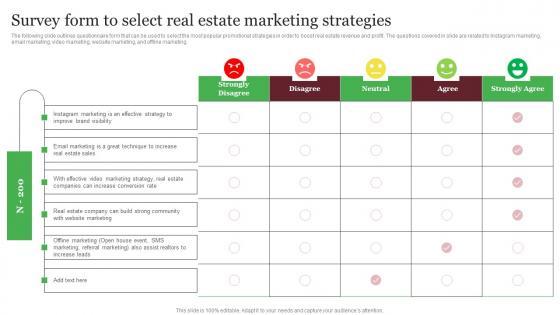 The following slide outlines questionnaire form that can be used to select the most popular promotional strategies in order to boost real estate revenue and profit. The questions covered in slide are related to Instagram marketing, email marketing, video marketing, website marketing, and offline marketing. The best PPT templates are a great way to save time, energy, and resources. Slidegeeks have 100 percent editable powerpoint slides making them incredibly versatile. With these quality presentation templates, you can create a captivating and memorable presentation by combining visually appealing slides and effectively communicating your message. Download Survey Form To Select Real Estate Marketing Strategies Out Of The Box Real Summary Pdf from Slidegeeks and deliver a wonderful presentation. The following slide outlines questionnaire form that can be used to select the most popular promotional strategies in order to boost real estate revenue and profit. The questions covered in slide are related to Instagram marketing, email marketing, video marketing, website marketing, and offline marketing.