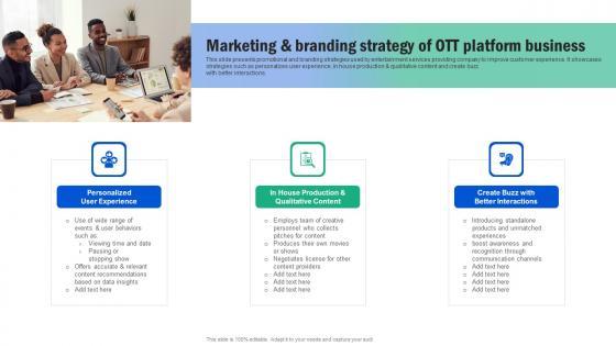 This slide presents promotional and branding strategies used by entertainment services providing company to improve customer experience. It showcases strategies such as personalizes user experience, in house production and qualitative content and create buzz with better interactions. Do you have to make sure that everyone on your team knows about any specific topic I yes, then you should give Marketing And Branding Strategy Of Ott Platform Guide For Segmenting And Formulating Inspiration Pdf a try. Our experts have put a lot of knowledge and effort into creating this impeccable Marketing And Branding Strategy Of Ott Platform Guide For Segmenting And Formulating Inspiration Pdf. You can use this template for your upcoming presentations, as the slides are perfect to represent even the tiniest detail. You can download these templates from the Slidegeeks website and these are easy to edit. So grab these today. This slide presents promotional and branding strategies used by entertainment services providing company to improve customer experience. It showcases strategies such as personalizes user experience, in house production and qualitative content and create buzz with better interactions.