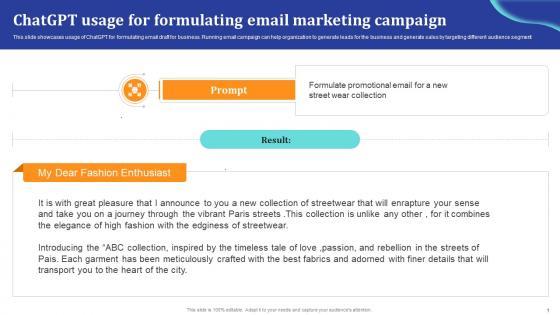 This slide showcases usage of ChatGPT for formulating email draft for business. Running email campaign can help organization to generate leads for the business and generate sales by targeting different audience segment. If you are looking for a format to display your unique thoughts, then the professionally designed ChatGpt Comprehensive Guide ChatGpt Usage For Formulating Email Ppt Template ChatGpt SS V is the one for you. You can use it as a Google Slides template or a PowerPoint template. Incorporate impressive visuals, symbols, images, and other charts. Modify or reorganize the text boxes as you desire. Experiment with shade schemes and font pairings. Alter, share or cooperate with other people on your work. Download ChatGpt Comprehensive Guide ChatGpt Usage For Formulating Email Ppt Template ChatGpt SS V and find out how to give a successful presentation. Present a perfect display to your team and make your presentation unforgettable. This slide showcases usage of ChatGPT for formulating email draft for business. Running email campaign can help organization to generate leads for the business and generate sales by targeting different audience segment.