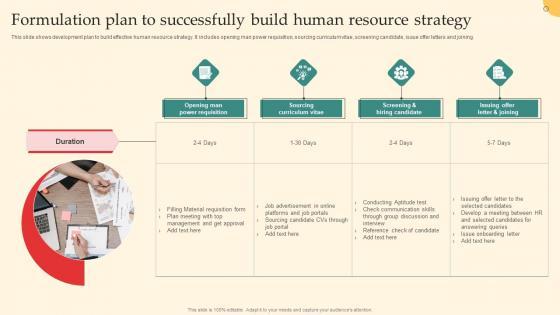 This slide shows development plan to build effective human resource strategy. It includes opening man power requisition,sourcing curriculum vitae,screening candidate,issue offer letters and joining. Pitch your topic with ease and precision using this Formulation Plan To Successfully Build Human Resource Strategy Professional Pdf. This layout presents information on Power Requisition,Curriculum Vitae,Hiring Candidate. It is also available for immediate download and adjustment. So,changes can be made in the color,design,graphics or any other component to create a unique layout. This slide shows development plan to build effective human resource strategy. It includes opening man power requisition,sourcing curriculum vitae,screening candidate,issue offer letters and joining.