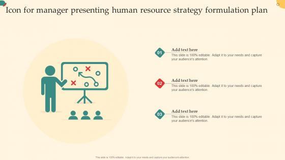 Showcasing this set of slides titled Icon For Manager Presenting Human Resource Strategy Formulation Plan Sample Pdf. The topics addressed in these templates are Manager Presenting,Human Resource,Strategy Formulation. All the content presented in this PPT design is completely editable. Download it and make adjustments in color,background,font etc. as per your unique business setting. Our Icon For Manager Presenting Human Resource Strategy Formulation Plan Sample Pdf are topically designed to provide an attractive backdrop to any subject. Use them to look like a presentation pro.