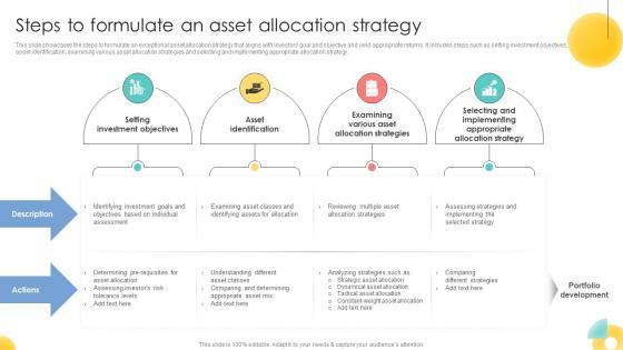 This slide showcases the steps to formulate an exceptional asset allocation strategy that aligns with investors goal and objective and yield appropriate returns. It includes steps such as setting investment objectives,asset identification, examining various asset allocation strategies and selecting and implementing appropriate allocation strategy.Find highly impressive Steps To Formulate An Asset Allocation Strategy Strategic Investment Plan For Optimizing Risk SS V on Slidegeeks to deliver a meaningful presentation. You can save an ample amount of time using these presentation templates. No need to worry to prepare everything from scratch because Slidegeeks experts have already done a huge research and work for you. You need to download Steps To Formulate An Asset Allocation Strategy Strategic Investment Plan For Optimizing Risk SS V for your upcoming presentation. All the presentation templates are 100 percent editable and you can change the color and personalize the content accordingly. Download now This slide showcases the steps to formulate an exceptional asset allocation strategy that aligns with investors goal and objective and yield appropriate returns. It includes steps such as setting investment objectives,asset identification, examining various asset allocation strategies and selecting and implementing appropriate allocation strategy.