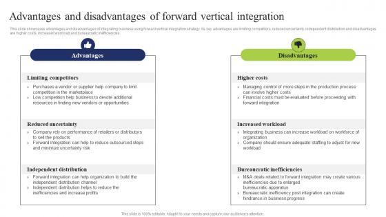 This slide showcases advantages and disadvantages of integrating business using forward vertical integration strategy. Its key advantages are limiting competitors, reduced uncertainty, independent distribution and disadvantages are higher costs, increased workload and bureaucratic inefficiencies. Presenting this PowerPoint presentation, titled Advantages And Disadvantages Of Forward Vertical Integration Designs PDF, with topics curated by our researchers after extensive research. This editable presentation is available for immediate download and provides attractive features when used. Download now and captivate your audience. Presenting this Advantages And Disadvantages Of Forward Vertical Integration Designs PDF. Our researchers have carefully researched and created these slides with all aspects taken into consideration. This is a completely customizable Advantages And Disadvantages Of Forward Vertical Integration Designs PDF that is available for immediate downloading. Download now and make an impact on your audience. Highlight the attractive features available with our PPTs.