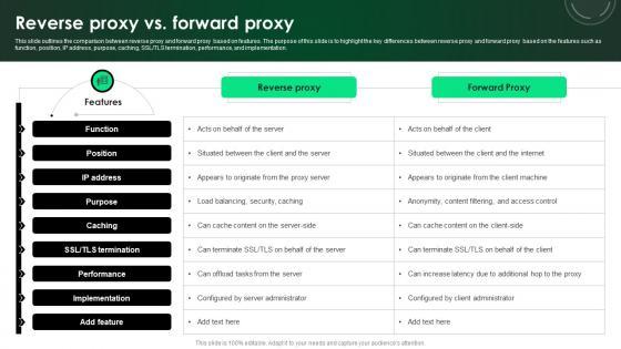 This slide outlines the comparison between reverse proxy and forward proxy based on features. The purpose of this slide is to highlight the key differences between reverse proxy and forward proxy based on the features such as function, position, IP address, purpose, caching, SSL or TLS termination, performance, and implementation. If your project calls for a presentation, then Slidegeeks is your go to partner because we have professionally designed, easy to edit templates that are perfect for any presentation. After downloading, you can easily edit Reverse Proxy Vs Forward Proxy Ppt PowerPoint Presentation File Outline PDF and make the changes accordingly. You can rearrange slides or fill them with different images. Check out all the handy templates.