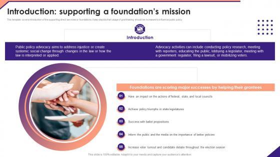 This template covers introduction of the supporting direct services or foundations. it also depicts that usage of grantmaking should be increased to influence public policy. Deliver and pitch your topic in the best possible manner with this Charitable Leadership Playbook For Policy Advocacy Introduction Supporting A Foundations Mission Themes PDF. Use them to share invaluable insights on Foundations Are Scoring, Their Grantees, State Legislatures and impress your audience. This template can be altered and modified as per your expectations. So, grab it now.