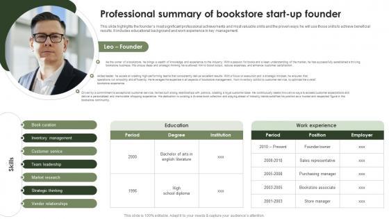 This slide highlights the founders most significant professional achievements and most valuable skills and the proven ways he will use those skills to achieve beneficial results. It includes educational background and work experience in key management. Retrieve professionally designed Online Bookstore Business Plan Professional Summary Of Bookstore Start Up Founder BP SS V to effectively convey your message and captivate your listeners. Save time by selecting pre-made slideshows that are appropriate for various topics, from business to educational purposes. These themes come in many different styles, from creative to corporate, and all of them are easily adjustable and can be edited quickly. Access them as PowerPoint templates or as Google Slides themes. You do not have to go on a hunt for the perfect presentation because Slidegeeks got you covered from everywhere. This slide highlights the founders most significant professional achievements and most valuable skills and the proven ways he will use those skills to achieve beneficial results. It includes educational background and work experience in key management.