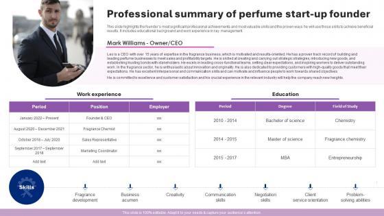 This slide highlights the founders most significant professional achievements and most valuable skills and the proven ways he will use those skills to achieve beneficial results. It includes educational background and work experience in key management. Retrieve professionally designed Perfume Manufacturing Business Plan Professional Summary Of Perfume Start Up Founder BP SS V to effectively convey your message and captivate your listeners. Save time by selecting pre-made slideshows that are appropriate for various topics, from business to educational purposes. These themes come in many different styles, from creative to corporate, and all of them are easily adjustable and can be edited quickly. Access them as PowerPoint templates or as Google Slides themes. You do not have to go on a hunt for the perfect presentation because Slidegeeks got you covered from everywhere. This slide highlights the founders most significant professional achievements and most valuable skills and the proven ways he will use those skills to achieve beneficial results. It includes educational background and work experience in key management.