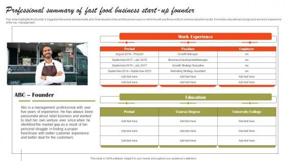 This slide highlights the founders biggest professional achievements and most valuable skills and the proven ways in which he will use those skills to achieve valuable results. It includes educational background and work experience of the key management. Presenting this PowerPoint presentation, titled Professional Summary Of Fast Food Business Start Up Founder Small Fast Food Business Plan Rules Pdf with topics curated by our researchers after extensive research. This editable presentation is available for immediate download and provides attractive features when used. Download now and captivate your audience. Presenting this Professional Summary Of Fast Food Business Start Up Founder Small Fast Food Business Plan Rules Pdf Our researchers have carefully researched and created these slides with all aspects taken into consideration. This is a completely customizable Professional Summary Of Fast Food Business Start Up Founder Small Fast Food Business Plan Rules Pdf that is available for immediate downloading. Download now and make an impact on your audience. Highlight the attractive features available with our PPTs. This slide highlights the founders biggest professional achievements and most valuable skills and the proven ways in which he will use those skills to achieve valuable results. It includes educational background and work experience of the key management.
