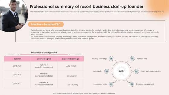 This slide shows the professional summary of resort business start-up founder which includes educational qualification and skills such as industry knowledge, adaptability, leadership skills, etc. Are you searching for a Spa Resort Business Plan Professional Summary Of Resort Business Start Up Founder BP SS V that is uncluttered, straightforward, and original Its easy to edit, and you can change the colors to suit your personal or business branding. For a presentation that expresses how much effort you have put in, this template is ideal With all of its features, including tables, diagrams, statistics, and lists, its perfect for a business plan presentation. Make your ideas more appealing with these professional slides. Download Spa Resort Business Plan Professional Summary Of Resort Business Start Up Founder BP SS V from Slidegeeks today. This slide shows the professional summary of resort business start-up founder which includes educational qualification and skills such as industry knowledge, adaptability, leadership skills, etc.