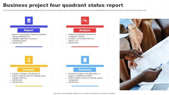 This slide showcases project departments quarterly report. The main purpose of this slide is providing overview of business project, highlighting performance of employees, achievements, future plans, etc. Showcasing this set of slides titled Business Project Four Quadrant Status Report Summary pdf. The topics addressed in these templates are Employees, Achievements, Future Plans. All the content presented in this PPT design is completely editable. Download it and make adjustments in color, background, font etc. as per your unique business setting. This slide showcases project departments quarterly report. The main purpose of this slide is providing overview of business project, highlighting performance of employees, achievements, future plans, etc.