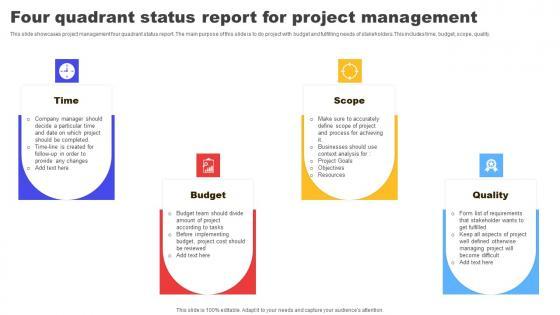 This slide showcases project management four quadrant status report. The main purpose of this slide is to do project with budget and fulfilling needs of stakeholders. This includes time, budget, scope, quality. Pitch your topic with ease and precision using this Four Quadrant Status Report For Project Management Microsoft pdf. This layout presents information on Includes Time, Budget, Scope, Quality. It is also available for immediate download and adjustment. So, changes can be made in the color, design, graphics or any other component to create a unique layout. This slide showcases project management four quadrant status report. The main purpose of this slide is to do project with budget and fulfilling needs of stakeholders. This includes time, budget, scope, quality.