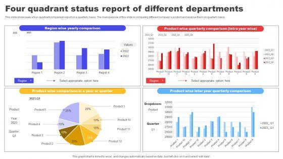 This slide showcases a four-quadrant comparison report on a quarterly basis. The main purpose of this slide is comparing different companys product and analyse them on quarterly basis. Pitch your topic with ease and precision using this Four Quadrant Status Report Of Different Departments Clipart pdf. This layout presents information on Region Wise,Yearly Comparison,Product Wise Compariso. It is also available for immediate download and adjustment. So, changes can be made in the color, design, graphics or any other component to create a unique layout. This slide showcases a four-quadrant comparison report on a quarterly basis. The main purpose of this slide is comparing different companys product and analyse them on quarterly basis.