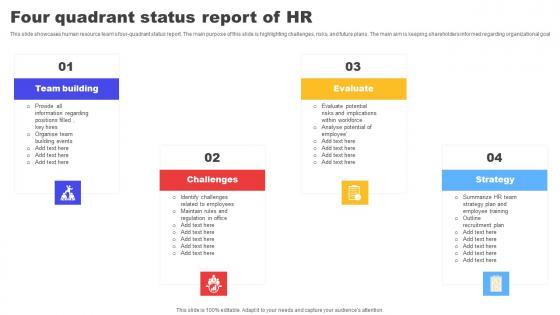 This slide showcases human resource teams four-quadrant status report. The main purpose of this slide is highlighting challenges, risks, and future plans. The main aim is keeping shareholders informed regarding organizational goal. Showcasing this set of slides titled Four Quadrant Status Report Of HR Summary pdf. The topics addressed in these templates are Team Building,Challenges,Evaluate,Strategy. All the content presented in this PPT design is completely editable. Download it and make adjustments in color, background, font etc. as per your unique business setting. This slide showcases human resource teams four-quadrant status report. The main purpose of this slide is highlighting challenges, risks, and future plans. The main aim is keeping shareholders informed regarding organizational goal.