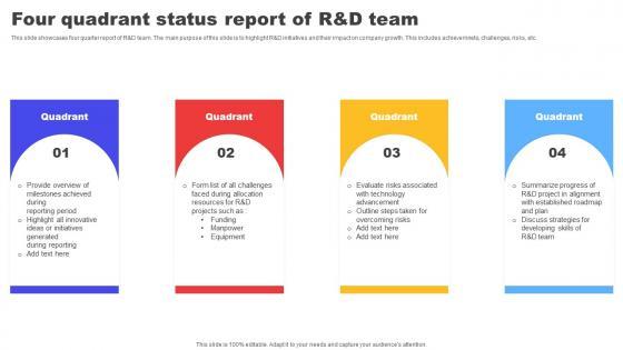 This slide showcases four quarter report of RandD team. The main purpose of this slide is to highlight RandD initiatives and their impact on company growth. This includes achievemnets, challenges, risks, etc. Showcasing this set of slides titled Four Quadrant Status Report Of R And D Team Brochure pdf. The topics addressed in these templates are Achievemnets, Challenges, Risks. All the content presented in this PPT design is completely editable. Download it and make adjustments in color, background, font etc. as per your unique business setting. This slide showcases four quarter report of RandD team. The main purpose of this slide is to highlight RandD initiatives and their impact on company growth. This includes achievemnets, challenges, risks, etc.