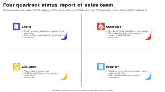 This slide showcases sales team quadrant report. The main purpose of this template is to provide overview of sales team performance. This includes sales team achievements, risks, challenges, future plans, etc. Pitch your topic with ease and precision using this Four Quadrant Status Report Of Sales Team Inspiration pdf. This layout presents information on Listing,Challenges,Summary,Evaluation. It is also available for immediate download and adjustment. So, changes can be made in the color, design, graphics or any other component to create a unique layout. This slide showcases sales team quadrant report. The main purpose of this template is to provide overview of sales team performance. This includes sales team achievements, risks, challenges, future plans, etc.