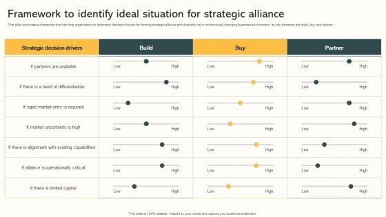 This slide showcases framework that can help organization to determine decision drivers for forming strategic alliance and diversify risk in continuously changing business environment. Its key elements are build, buy and partner. Coming up with a presentation necessitates that the majority of the effort goes into the content and the message you intend to convey. The visuals of a PowerPoint presentation can only be effective if it supplements and supports the story that is being told. Keeping this in mind our experts created Framework To Identify Ideal Situation For Strategic Alliance Strategic Diversification Plan Slides PDF to reduce the time that goes into designing the presentation. This way, you can concentrate on the message while our designers take care of providing you with the right template for the situation. This slide showcases framework that can help organization to determine decision drivers for forming strategic alliance and diversify risk in continuously changing business environment. Its key elements are build, buy and partner.
