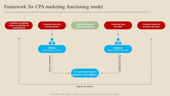 This slide showcase the framework model of CPA marketing functioning. It includes steps such as, customer ad view, affiliate advertisement, ad link tracking, offer purchase, customer, commission delivery etc. Do you have an important presentation coming up Are you looking for something that will make your presentation stand out from the rest Look no further than Framework For CPA Marketing Introduction And Implementation Procedure Template Pdf. With our professional designs, you can trust that your presentation will pop and make delivering it a smooth process. And with Slidegeeks, you can trust that your presentation will be unique and memorable. So why wait Grab Framework For CPA Marketing Introduction And Implementation Procedure Template Pdf today and make your presentation stand out from the rest. This slide showcase the framework model of CPA marketing functioning. It includes steps such as, customer ad view, affiliate advertisement, ad link tracking, offer purchase, customer, commission delivery etc.