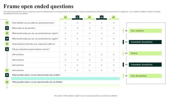 This slide represents the FAQs for analysing customer satisfaction from company products and services. It displays questionnaire which has to be answered from 5 categories very satisfied, satisfied, neutral, somewhat dissatisfied, and very dissatisfied. If you are looking for a format to display your unique thoughts, then the professionally designed Optimizing Multichannel Strategy To Improve User Experience Frame Open Ended Questions Download PDF is the one for you. You can use it as a Google Slides template or a PowerPoint template. Incorporate impressive visuals, symbols, images, and other charts. Modify or reorganize the text boxes as you desire. Experiment with shade schemes and font pairings. Alter, share or cooperate with other people on your work. Download Optimizing Multichannel Strategy To Improve User Experience Frame Open Ended Questions Download PDF and find out how to give a successful presentation. Present a perfect display to your team and make your presentation unforgettable.
