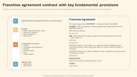This slide represents franchisee agreement that used to legally bind franchisee and franchisor. It includes relationship between contract parties, control over franchisor, brand management etc. Crafting an eye catching presentation has never been more straightforward. Let your presentation shine with this tasteful yet straightforward Franchise Agreement Contract With Key Fundamental Provisions Structure PDF template. It offers a minimalistic and classy look that is great for making a statement. The colors have been employed intelligently to add a bit of playfulness while still remaining professional. Construct the ideal Franchise Agreement Contract With Key Fundamental Provisions Structure PDF that effortlessly grabs the attention of your audience Begin now and be certain to wow your customers.