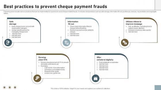Following slide includes various practices that can be implemented by business to avoid cheque related frauds. It includes best practices such as safe storage, information fill out, positive pay services, reconciliation and segregate duties. Slidegeeks has constructed Cashless Payment Strategies To Enhance Business Performance Best Practices To Prevent Cheque Payment Frauds Brochure PDF after conducting extensive research and examination. These presentation templates are constantly being generated and modified based on user preferences and critiques from editors. Here, you will find the most attractive templates for a range of purposes while taking into account ratings and remarks from users regarding the content. This is an excellent jumping-off point to explore our content and will give new users an insight into our top-notch PowerPoint Templates.