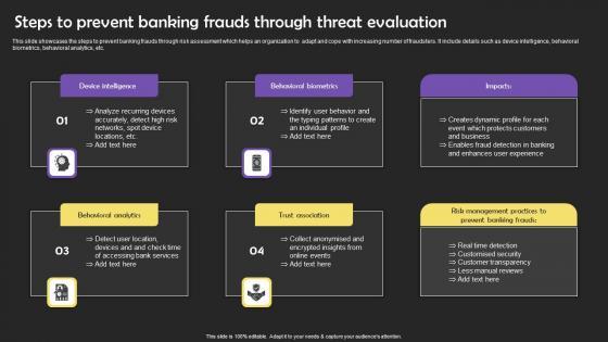 This slide showcases the steps to prevent banking frauds through risk assessment which helps an organization to adapt and cope with increasing number of fraudsters. It include details such as device intelligence, behavioral biometrics, behavioral analytics, etc. Showcasing this set of slides titled Steps To Prevent Banking Frauds Through Threat Evaluation Microsoft Pdf The topics addressed in these templates are Steps To Prevent Banking Frauds Through Threat Evaluation Microsoft Pdf All the content presented in this PPT design is completely editable. Download it and make adjustments in color, background, font etc. as per your unique business setting. This slide showcases the steps to prevent banking frauds through risk assessment which helps an organization to adapt and cope with increasing number of fraudsters. It include details such as device intelligence, behavioral biometrics, behavioral analytics, etc.