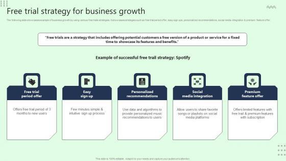 The following slide showcases example of business growth by using various free trails strategies. It showcases strategies such as free trial period offer, easy sign ups, personalized recommendations, social media integration and premium feature offer. This modern and well-arranged Free Trial Strategy For Business Growth Business Growth And Brand Development Plan Topics PDF provides lots of creative possibilities. It is very simple to customize and edit with the Powerpoint Software. Just drag and drop your pictures into the shapes. All facets of this template can be edited with Powerpoint, no extra software is necessary. Add your own material, put your images in the places assigned for them, adjust the colors, and then you can show your slides to the world, with an animated slide included.