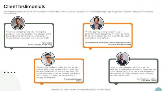 Mentioned slide provides insights into esteemed customers review related to offered services by company. It includes reviews from Transport sourcing manager Ardagh Group , transportation manager Unilever , Associate Director P and G , etc. Create an editable Client Testimonials Freight Management Solution Investor Funding Elevator Pitch Deck that communicates your idea and engages your audience. Whether you are presenting a business or an educational presentation, pre-designed presentation templates help save time. Client Testimonials Freight Management Solution Investor Funding Elevator Pitch Deck is highly customizable and very easy to edit, covering many different styles from creative to business presentations. Slidegeeks has creative team members who have crafted amazing templates. So, go and get them without any delay. Mentioned slide provides insights into esteemed customers review related to offered services by company. It includes reviews from Transport sourcing manager Ardagh Group , transportation manager Unilever , Associate Director P and G , etc.