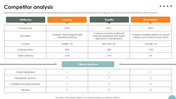 Mentioned slide showcases comparative analysis between digital freight management companies. It includes key attributed such as founding years, location, employee base, twitter following, offered services, etc. Want to ace your presentation in front of a live audience Our Competitor Analysis Freight Management Solution Investor Funding Elevator Pitch Deck can help you do that by engaging all the users towards you. Slidegeeks experts have put their efforts and expertise into creating these impeccable powerpoint presentations so that you can communicate your ideas clearly. Moreover, all the templates are customizable, and easy-to-edit and downloadable. Use these for both personal and commercial use. Mentioned slide showcases comparative analysis between digital freight management companies. It includes key attributed such as founding years, location, employee base, twitter following, offered services, etc.