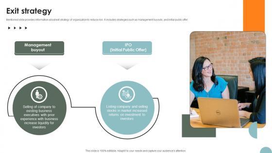 Mentioned slide provides information about exit strategy of organization to reduce risk. It includes strategies such as management buyouts, and initial public offer. From laying roadmaps to briefing everything in detail, our templates are perfect for you. You can set the stage with your presentation slides. All you have to do is download these easy-to-edit and customizable templates. Exit Strategy Freight Management Solution Investor Funding Elevator Pitch Deck will help you deliver an outstanding performance that everyone would remember and praise you for. Do download this presentation today. Mentioned slide provides information about exit strategy of organization to reduce risk. It includes strategies such as management buyouts, and initial public offer.