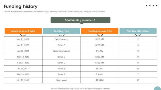 This slide represents digital freight network company funding history. It includes announcement date, funding amount, funding type, number of investors. Do you have an important presentation coming up Are you looking for something that will make your presentation stand out from the rest Look no further than Funding History Freight Management Solution Investor Funding Elevator Pitch Deck. With our professional designs, you can trust that your presentation will pop and make delivering it a smooth process. And with Slidegeeks, you can trust that your presentation will be unique and memorable. So why wait Grab Funding History Freight Management Solution Investor Funding Elevator Pitch Deck today and make your presentation stand out from the rest This slide represents digital freight network company funding history. It includes announcement date, funding amount, funding type, number of investors,