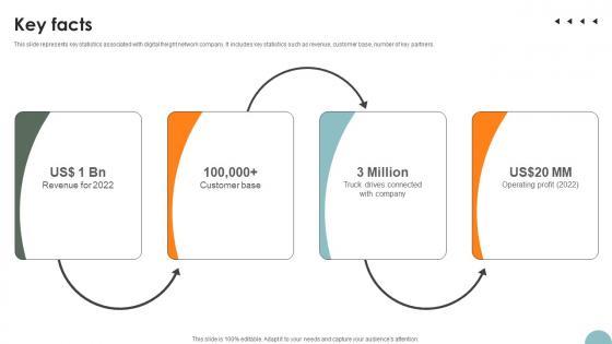 This slide represents key statistics associated with digital freight network company. It includes key statistics such as revenue, customer base, number of key partners. This slide represents key statistics associated with digital freight network company. It includes key statistics such as revenue, customer base, number of key partners. If your project calls for a presentation, then Slidegeeks is your go-to partner because we have professionally designed, easy-to-edit templates that are perfect for any presentation. After downloading, you can easily edit Key Facts Freight Management Solution Investor Funding Elevator Pitch Deck and make the changes accordingly. You can rearrange slides or fill them with different images. Check out all the handy templates This slide represents key statistics associated with digital freight network company. It includes key statistics such as revenue, customer base, number of key partners.