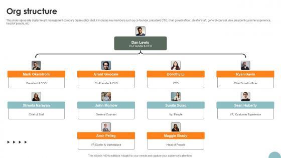This slide represents digital freight management company organisation chat. It includes key members such as co-founder, president, CTO, chief growth officer, chief of staff, general counsel, Vice president customer experience, head of people, etc. Crafting an eye-catching presentation has never been more straightforward. Let your presentation shine with this tasteful yet straightforward Org Structure Freight Management Solution Investor Funding Elevator Pitch Deck template. It offers a minimalistic and classy look that is great for making a statement. The colors have been employed intelligently to add a bit of playfulness while still remaining professional. Construct the ideal Org Structure Freight Management Solution Investor Funding Elevator Pitch Deck that effortlessly grabs the attention of your audience Begin now and be certain to wow your customers This slide represents digital freight management company organisation chat. It includes key members such as co-founder, president, CTO, chief growth officer, chief of staff, general counsel, Vice president customer experience, head of people, etc.