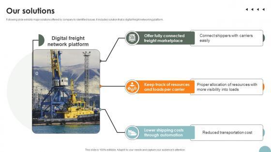 Following slide exhibits major solutions offered by company to identified issues. It includes solution that is digital freight networking platform. Make sure to capture your audiences attention in your business displays with our gratis customizable Our Solutions Freight Management Solution Investor Funding Elevator Pitch Deck. These are great for business strategies, office conferences, capital raising or task suggestions. If you desire to acquire more customers for your tech business and ensure they stay satisfied, create your own sales presentation with these plain slides. Following slide exhibits major solutions offered by company to identified issues. It includes solution that is digital freight networking platform.