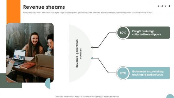 Mentioned slide provides information about digital freight company revenue generation sources. It includes revenue streams such as website platform and small e-commerce store. This modern and well-arranged Revenue Streams Freight Management Solution Investor Funding Elevator Pitch Deck provides lots of creative possibilities. It is very simple to customize and edit with the Powerpoint Software. Just drag and drop your pictures into the shapes. All facets of this template can be edited with Powerpoint, no extra software is necessary. Add your own material, put your images in the places assigned for them, adjust the colors, and then you can show your slides to the world, with an animated slide included. Mentioned slide provides information about digital freight company revenue generation sources. It includes revenue streams such as website platform and small e-commerce store.