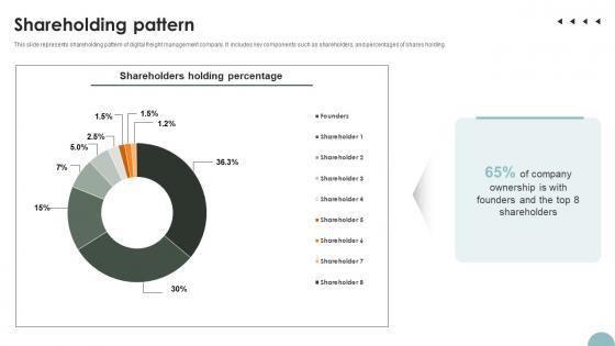 This slide represents shareholding pattern of digital freight management company. It includes key components such as shareholders, and percentages of shares holding. This Shareholding Pattern Freight Management Solution Investor Funding Elevator Pitch Deck is perfect for any presentation, be it in front of clients or colleagues. It is a versatile and stylish solution for organizing your meetings. The Shareholding Pattern Freight Management Solution Investor Funding Elevator Pitch Deck features a modern design for your presentation meetings. The adjustable and customizable slides provide unlimited possibilities for acing up your presentation. Slidegeeks has done all the homework before launching the product for you. So, do not wait, grab the presentation templates today This slide represents shareholding pattern of digital freight management company. It includes key components such as shareholders, and percentages of shares holding.