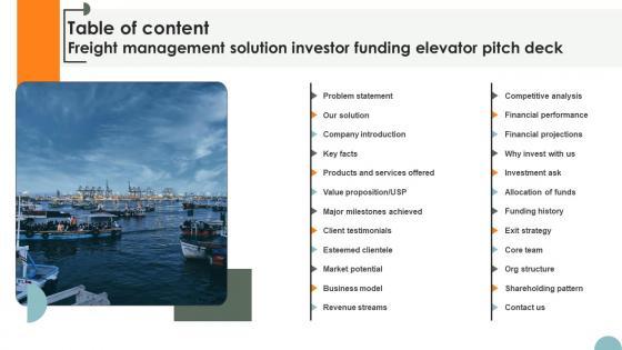 Welcome to our selection of the Table Of Content Freight Management Solution Investor Funding Elevator Pitch Deck. These are designed to help you showcase your creativity and bring your sphere to life. Planning and Innovation are essential for any business that is just starting out. This collection contains the designs that you need for your everyday presentations. All of our PowerPoints are 100 percent editable, so you can customize them to suit your needs. This multi-purpose template can be used in various situations. Grab these presentation templates today. Our Table Of Content Freight Management Solution Investor Funding Elevator Pitch Deck are topically designed to provide an attractive backdrop to any subject. Use them to look like a presentation pro.