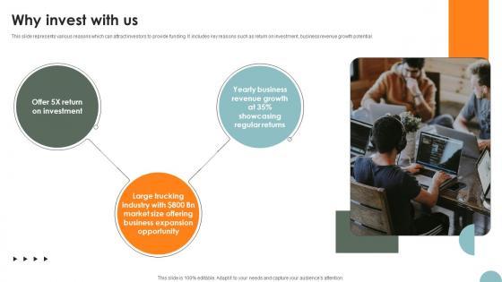The best PPT templates are a great way to save time, energy, and resources. Slidegeeks have 100 percent editable powerpoint slides making them incredibly versatile. With these quality presentation templates, you can create a captivating and memorable presentation by combining visually appealing slides and effectively communicating your message. Download Why Invest With Us Freight Management Solution Investor Funding Elevator Pitch Deck from Slidegeeks and deliver a wonderful presentation. Our Why Invest With Us Freight Management Solution Investor Funding Elevator Pitch Deck are topically designed to provide an attractive backdrop to any subject. Use them to look like a presentation pro.