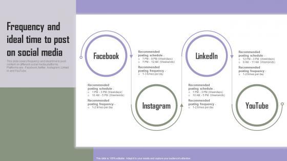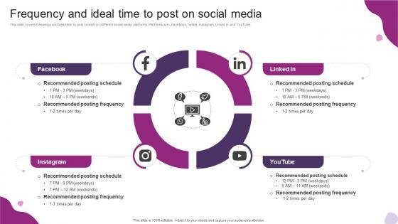 This slide covers frequency and ideal time to post content on different social media platforms. Platforms are Facebook, twitter, Instagram, Linked In and YouTube. If your project calls for a presentation, then Slidegeeks is your go-to partner because we have professionally designed, easy-to-edit templates that are perfect for any presentation. After downloading, you can easily edit Frequency And Ideal Time To Post On Social Media Powerful Marketing Techniques Strategy SS V and make the changes accordingly. You can rearrange slides or fill them with different images. Check out all the handy templates This slide covers frequency and ideal time to post content on different social media platforms. Platforms are Facebook, twitter, Instagram, Linked In and YouTube.
