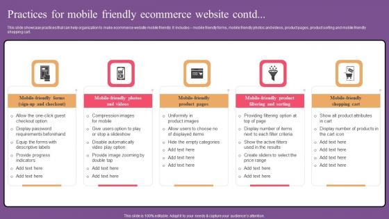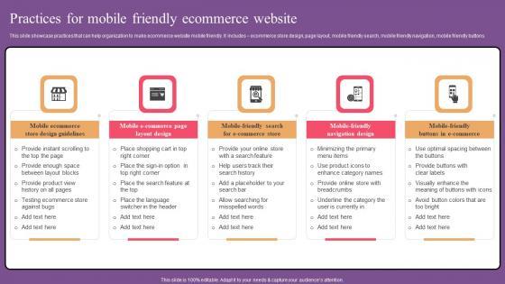 This slide showcase practices that can help organization to make ecommerce website mobile friendly. It includes ecommerce store design, page layout, mobile friendly search, mobile friendly navigation, mobile friendly buttons. Do you know about Slidesgeeks Practices For Mobile Friendly Website Optimization To Improve Product Sale Structure Pdf These are perfect for delivering any kind od presentation. Using it, create PowerPoint presentations that communicate your ideas and engage audiences. Save time and effort by using our pre designed presentation templates that are perfect for a wide range of topic. Our vast selection of designs covers a range of styles, from creative to business, and are all highly customizable and easy to edit. Download as a PowerPoint template or use them as Google Slides themes. This slide showcase practices that can help organization to make ecommerce website mobile friendly. It includes ecommerce store design, page layout, mobile friendly search, mobile friendly navigation, mobile friendly buttons.